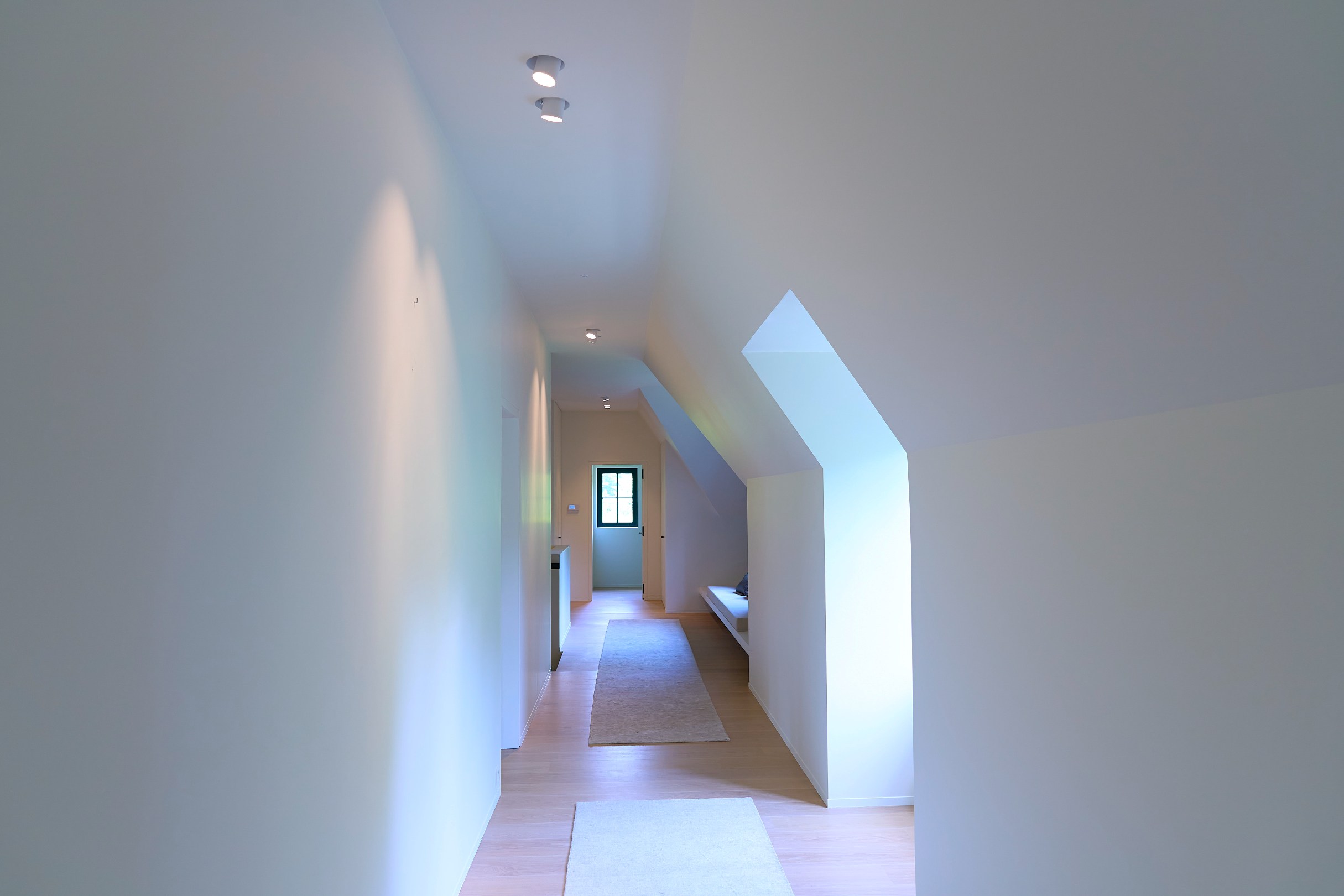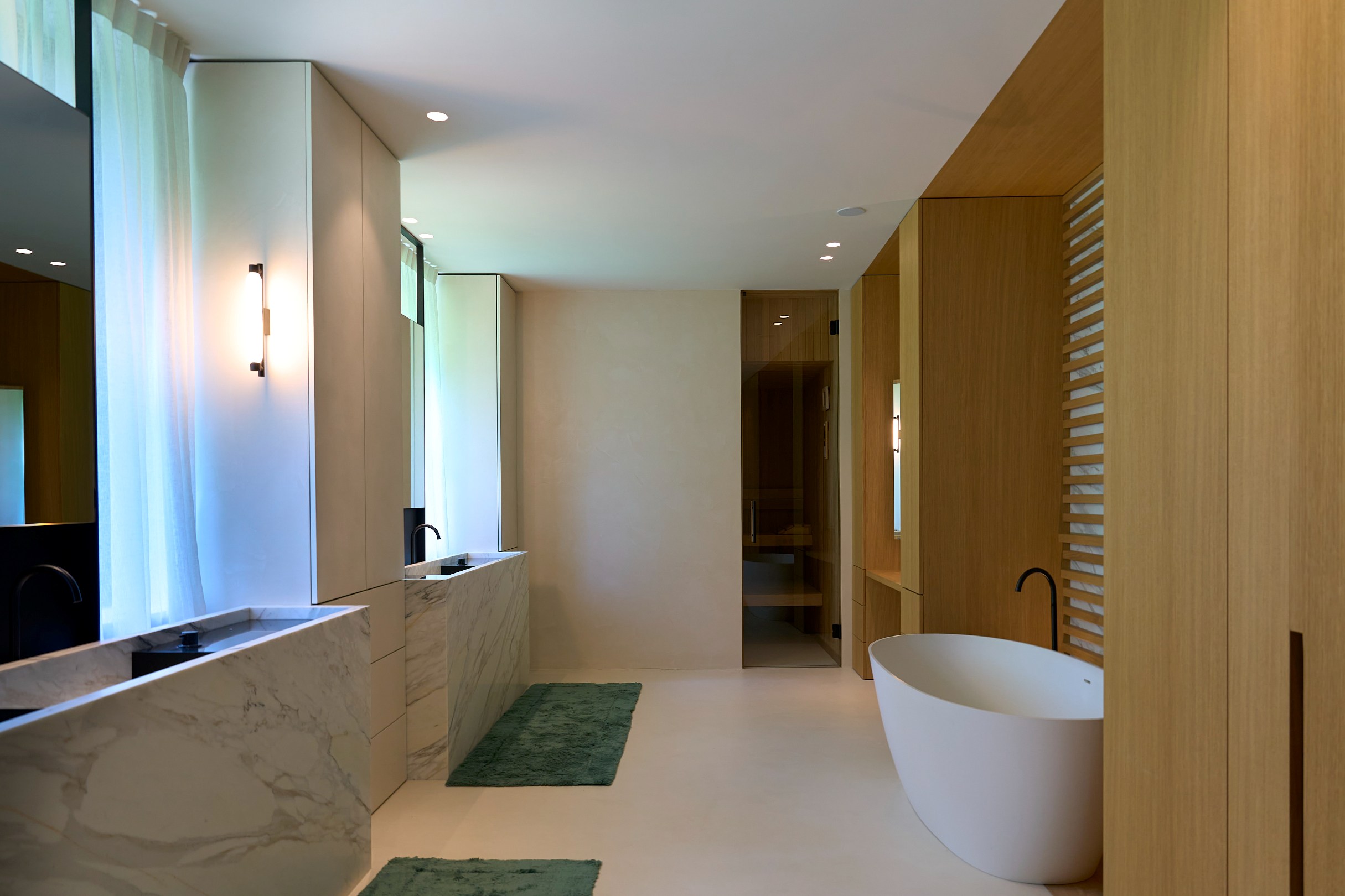 Indeling eerste verdieping: heel ruime overloop met wasplaats, riante ouderslaapkamer (open tot in de nok)met grote dressing met luxe schrijnwerk en ene superieure luxe badkamer, met dubbel inloopdouche, toilet, ligbad, marmeren wastafels en een sauna, tweede slaapkamer met ingemaakte kasten en luxe badkamer, derde slaapkamer, vierde heel ruime slaapkamer met ingemaakte kasten en luxe badkamer.